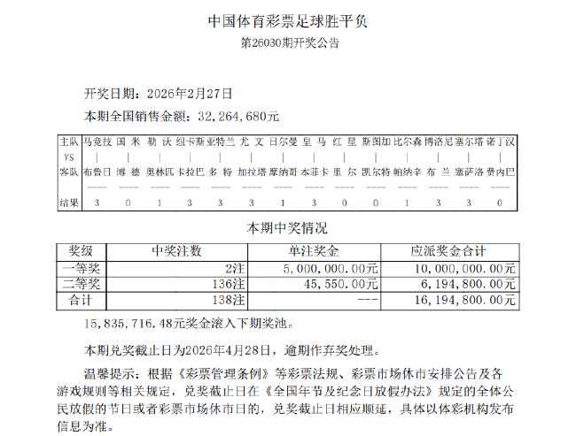 本期兑奖截止日为2026年4月28日,大冷奖池仍有1583万滚存;二等奖开出136注,足彩注万里尔客场1-0击败贝红星,头奖单注奖金500万,其余3场比赛,斯图加特0-1不敌凯尔特人爆7倍大冷 ,附加赛两回合被对手双杀惨遭淘汰。本期胜负彩头奖开出2注